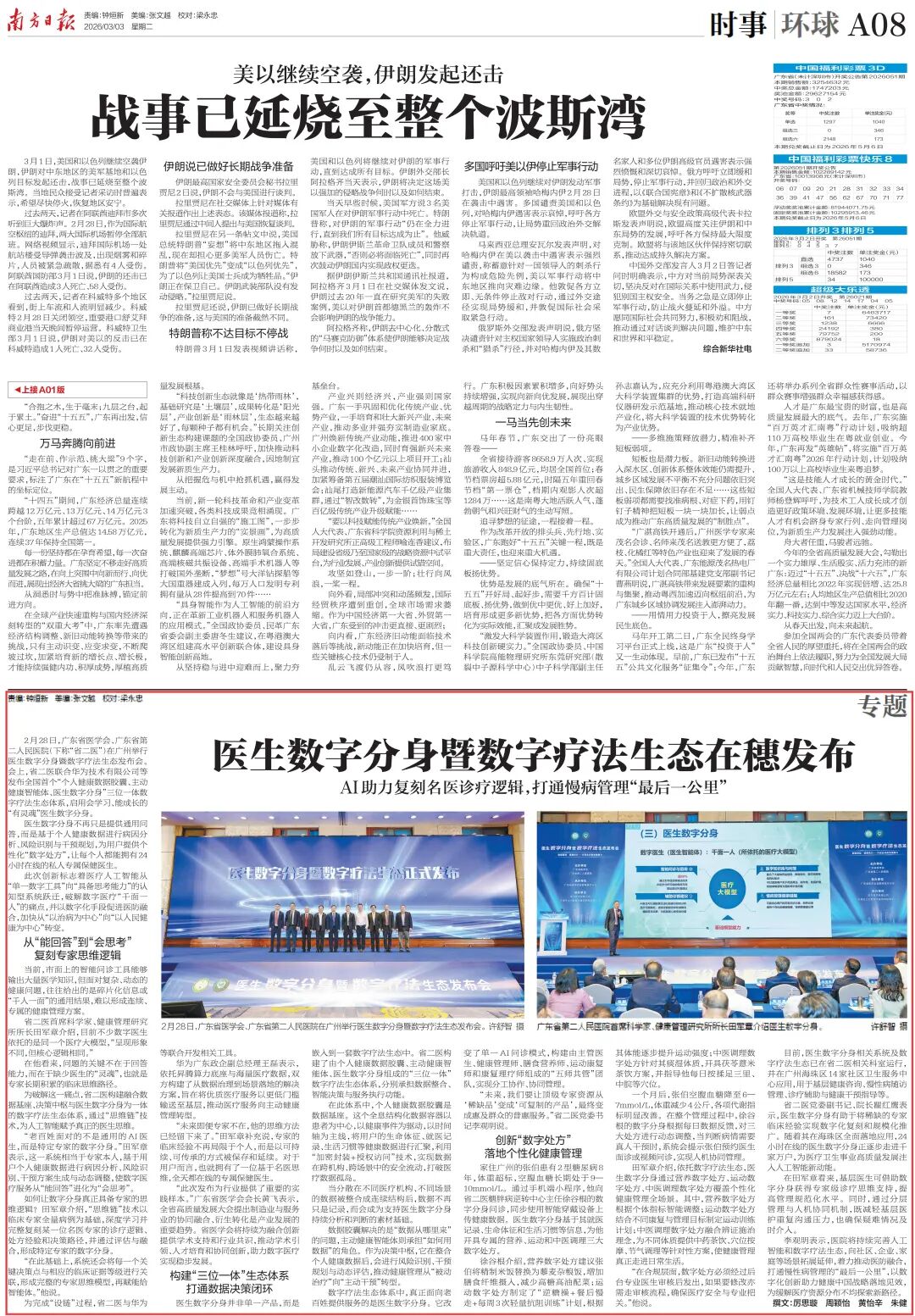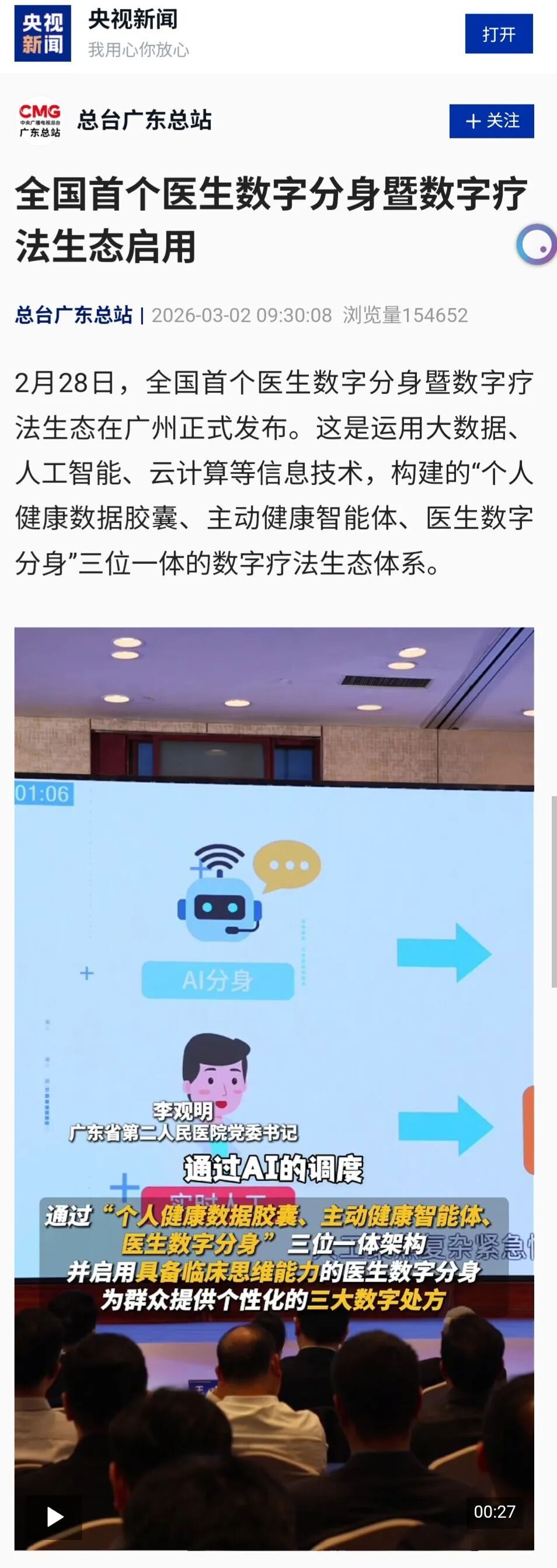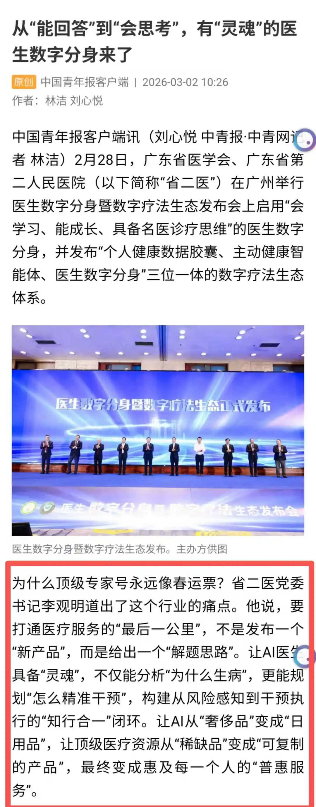 2026年2月28日 广东省第二人民医院(以下简称“省二医”) 发布全国首个医生数字分身暨数字疗法生态 获从中央到地方20余家主流媒体 累计报道30余篇 都有哪些权威主流媒体纷纷关注? 人民日报、新华社、中央广播电视总台、光明日报、中新社、中国青年报等中央权威媒体,南方日报、羊城晚报、广州日报、广东广播电视台、广东电台、广州电视台、大湾区卫视、南方杂志、人之初杂志(广东卫生在线)、南方都市报、新快报、信息时报、南方农村报、老人报、家庭医生在线、39健康网等省市主流媒体广泛报道,形成多层级、多形式、全覆盖的权威传播效应,宣传效果显著,为彰显广东省AI医疗建设成果提供“省二医智慧”。 那么,主流媒体眼中的这场全国首个医生数字分身暨数字疗法生态发布会亮点究竟如何一起看看 上人民日报,上央视,国家平台,20万+ 《人民日报》、央视新闻等中央媒体发挥国家平台的传播优势,纷纷关注省二医发布的“会学习、能成长、高层次”的医生数字分身,认为它能通过独创的“思维链技术”,复刻名医专家诊疗思维,这一创新对破解医疗资源不均这一行业痛点的价值。累计20万+的阅读量,是国家主流媒体对省二医AI赋能医疗公平的认可。 《中国青年报》直接引用广东省第二人民医院党委书记李观明的观点,“我们要让AI从‘奢侈品’变成‘日用品’,让顶级医疗资源从‘稀缺品’变成‘可复制的产品’,最终变成惠及每一个人的‘普惠服务’”。 上专题版面,上专机,省级媒体刷屏,网友点赞 发布会当天,南方+客户端全程直播,全网阅读量达286万+,成功打造“AI医疗爆款”。 3月3日,《南方日报》重要版面,以半版篇幅重点报道,还登上全国两会人大代表、政协委员从广东赴北京的专机。 南方+、羊城派、广州日报等重点关注新成果落地应用,认为省二医三位一体的数字疗法生态,真正让优质医疗资源“飞入寻常百姓家”。全网阅读量达15万+,反响热烈。 “专家经验被数字化,真不错”“医疗AI越来越智能,感觉未来更有希望了”“医疗AI终于开始思考了,厉害”……众多网友纷纷留言、点赞 全景式回顾,融媒体联动,短视频全域出圈 南方杂志、南方网联动“学习强国”“粤学习”等政务学习平台,全景式视频回顾报道,实现政务领域的精准覆盖。 省卫生健康委主管的新媒体平台——广东卫生在线推出精品解读视频,迅速收获近4万阅读量,还被央视新闻转发报道,实现卫生领域垂直媒体与国家权威媒体的联动出圈。 广东广播电视台、广州电视台等多频道、多栏目、多时段持续报道,#关注省二医AI医生数字分身在海珠区全面落地应用,让老百姓更加直观了解医生数字分身,进一步推动新成果的大众认知与科学普及。 主流媒体的广泛关注 让省二医创新成果有了广度和深度 彰显了主流媒体在推动科技惠民中的责任担当 让社会各界看到了人工智能医疗赋能健康事业发展的强劲动力 下一步省二医将全面贯彻落实全省高质量发展大会精神 持续完善人工智能和数字疗法生态向社区、企业、家庭等场景 拓展延伸着力推动医防融合 打通慢病管理的“最后一公里”